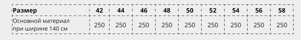 Расход материала указан в сантиметрах Тонкий дублерин при ширине полотна 150 см для всех размеров - 50 см Пуговицы диаметр 8-12мм - 5 шт