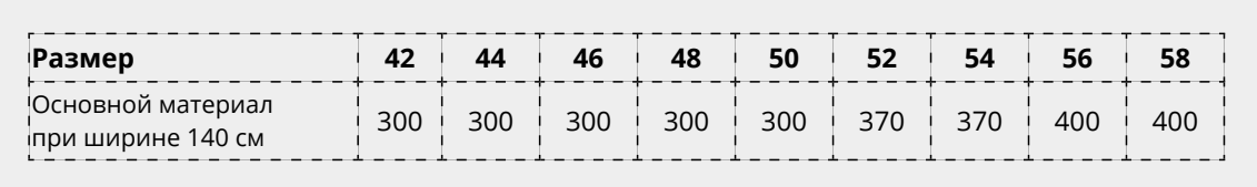 Расход материала указан в сантиметрах Тонкий дублерин при ширине полотна 150 см для всех размеров - 50 см Пуговицы диаметр 8-12мм - 13 шт